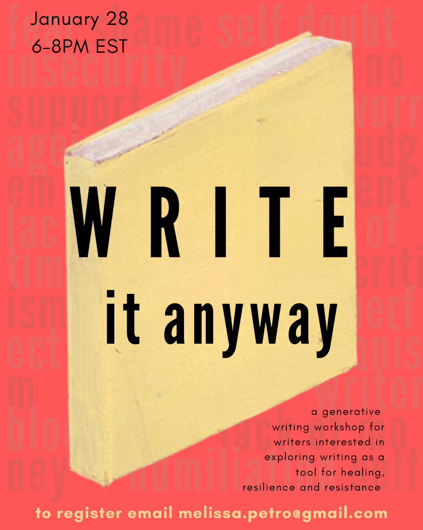 BRING YOUR BOOK TO LIFE: A 12-Month Nonfiction Book Incubator (25 sessions | Every Other Thursday, 7–9 PM EST | January 15 – December 17, 2026) is a year-long generative workshop for twelve writers committed to completing their book-length nonfiction manuscripts and/or book proposals in 2026. This is the year to write your book with guidance, accountability, and a supportive community of fellow writers. Sign up or for more info here.