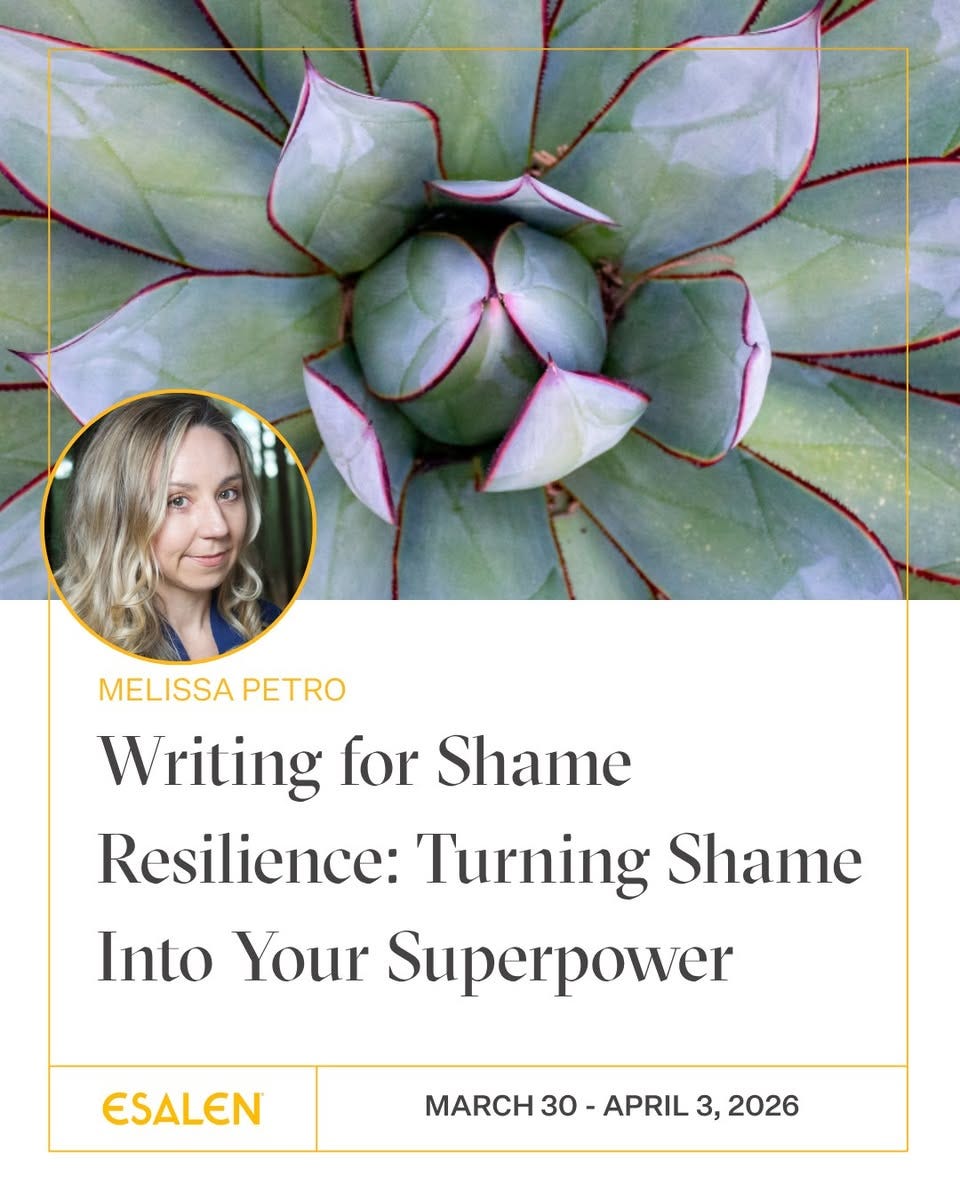 Writing for Shame Resilience: Turning Shame Into Your Superpower (March 30 – April 3 @ Esalen Institute, Big Sur, California) offers five days of in-person writing, reflection, and transformation. Over the course of the workshop, you’ll step into your most authentic self, learn to listen deeply to others and find the true connection you’ve been longing for. This is how to make it happen. Email me for more info or to register visit https://www.esalen.org/workshops/writing-for-shame-resilience-turning-shame-into-your-superpower-03302026 .